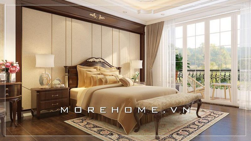 Nội thất phòng ngủ gỗ tự nhiên sang trọng và đẳng cấp, cùng với cửa hướng ra ban công được lựa chọn bằng chất liệu kính cường lực an toàn, tạo nên sự mềm mại và sinh động hơn.